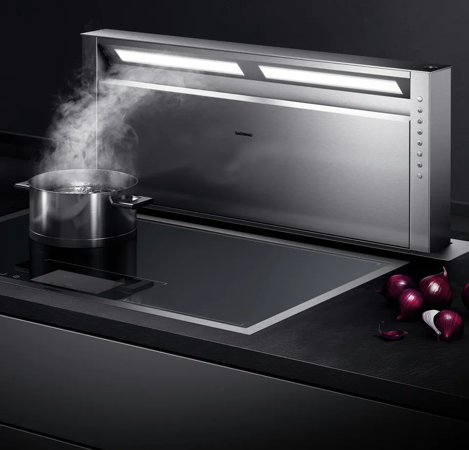 - Выдвижная вытяжка комбинируется со всеми варочными панелями Gaggenau. При необходимости полностью утапливаемая в столешницу.